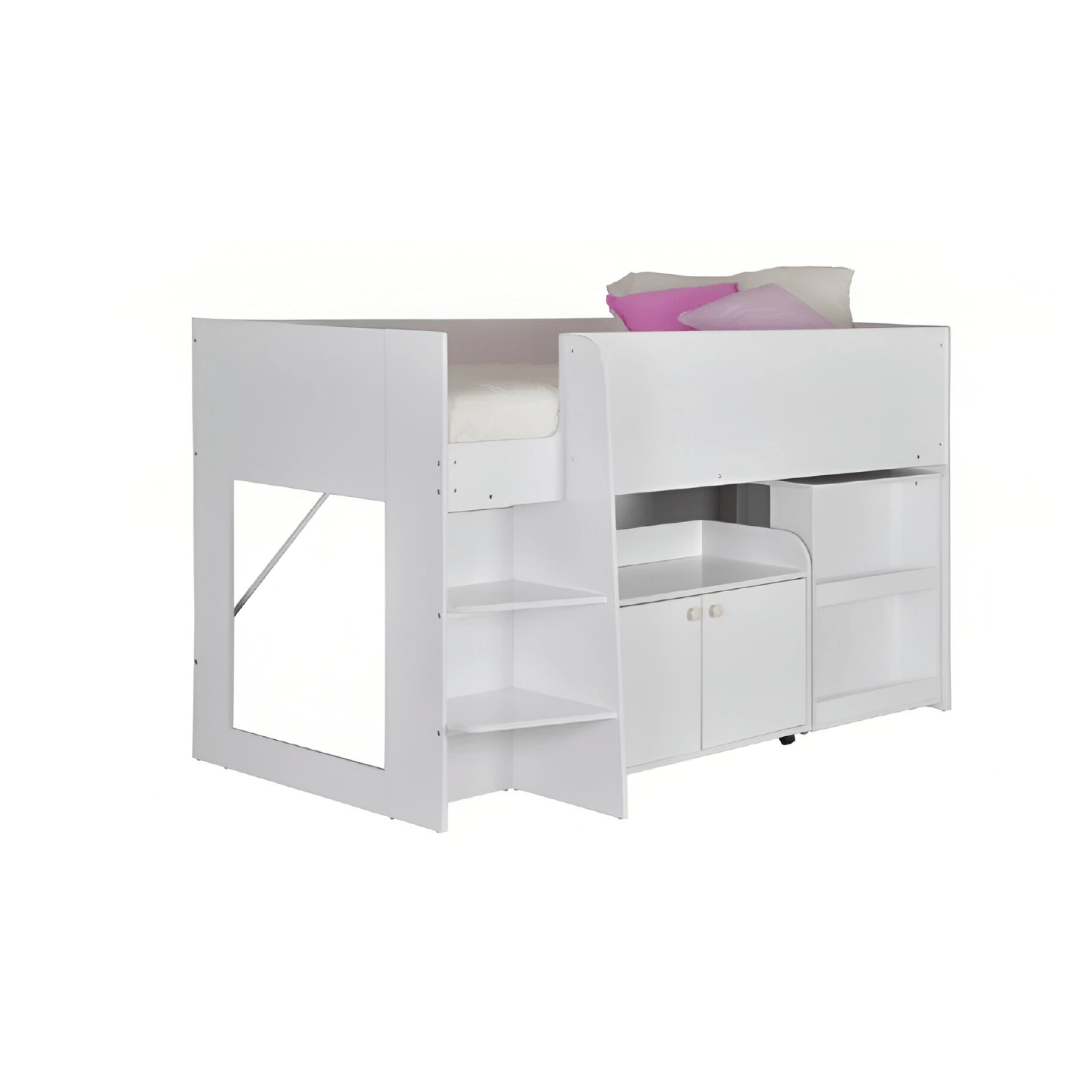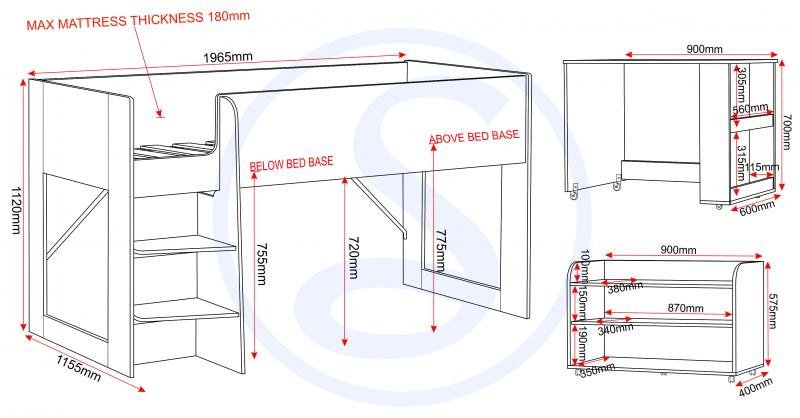 HEIGHT BELOW BED BASE H755 SLAT QUANTITY X15 SLAT SIZE 60MM X 20MM MAXIMUM MATTRESS THICKNESS 180MM UPPER OPEN SHELF SPACE W870 D380 H100 UPPER CUPBOARD SHELF W870 D340 H150 LOWER CUPBOARD SHELF W870 D350 H190 UPPER DESK SHELF W560 D115 H305 LOWER DESK SHELF W560 D115 H315 |