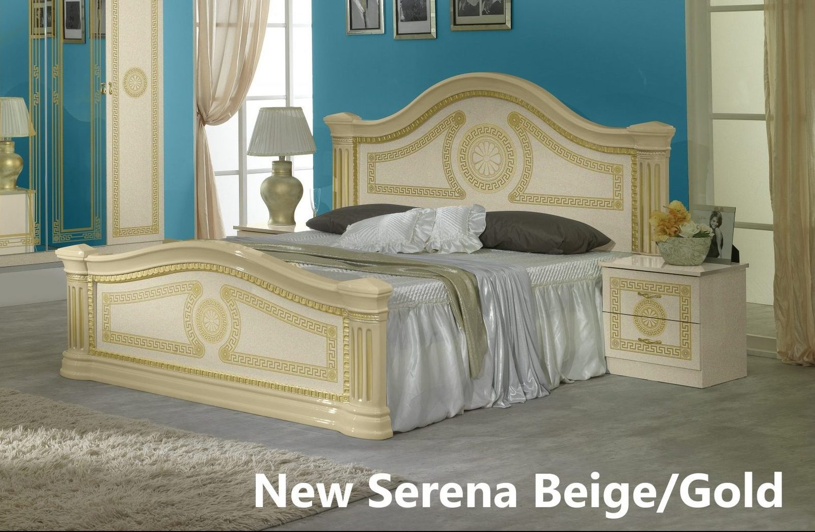 New Serena Bedroom Set, offers uncompromising comfort, luxury and performance whilst representing incredible value for money. This Bedroom Set included 4 Door Wardrobe, bed frame, 2 night tables, dresser and mirror all are made from beige high gloss finish with gold trimming and antique is a great example of modern furniture which combines modern style and practicality.