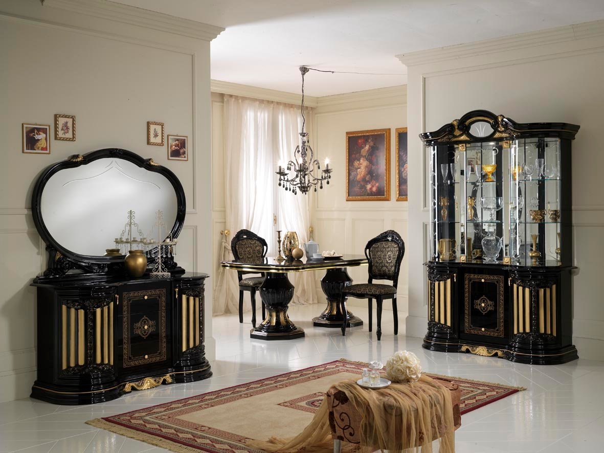 Betty Onyx Finish Buffet structure made of ecological-melamine 18 mm. Thick and sides and tops painted by polyester in Onyx high glossy finish with serigraphy in gold color and gold handles in polyurethane foam. Also backs made of fiber-board panels.