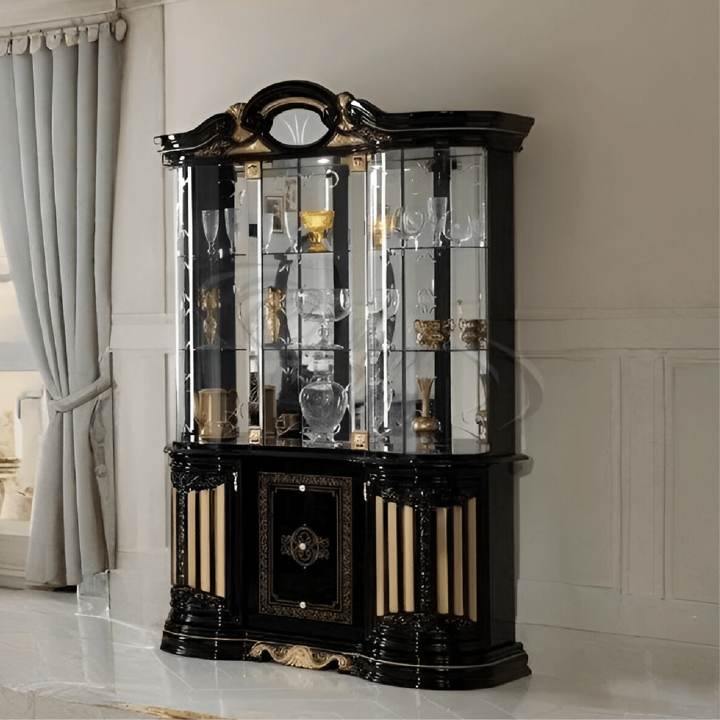 Betty 2 Door Display Unit in High Black & Gold Finish with Mirrored Detailing