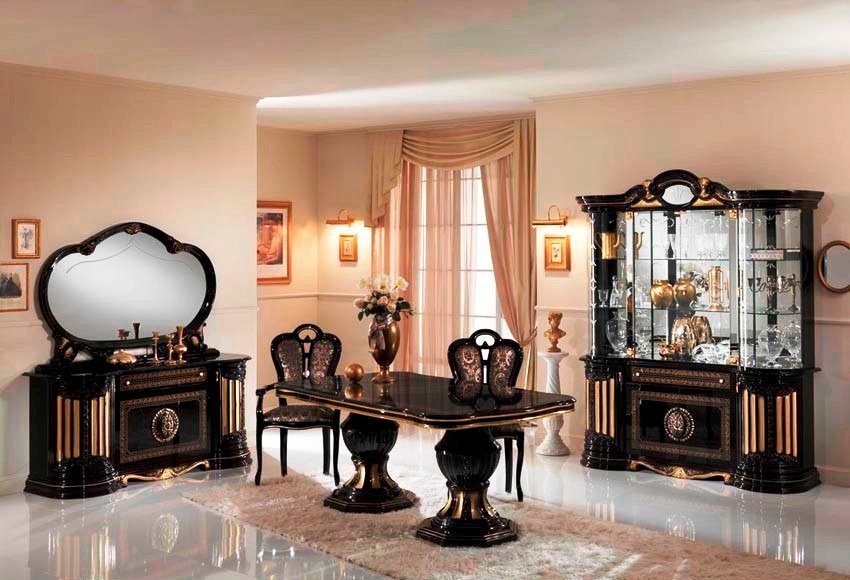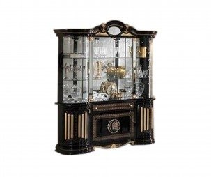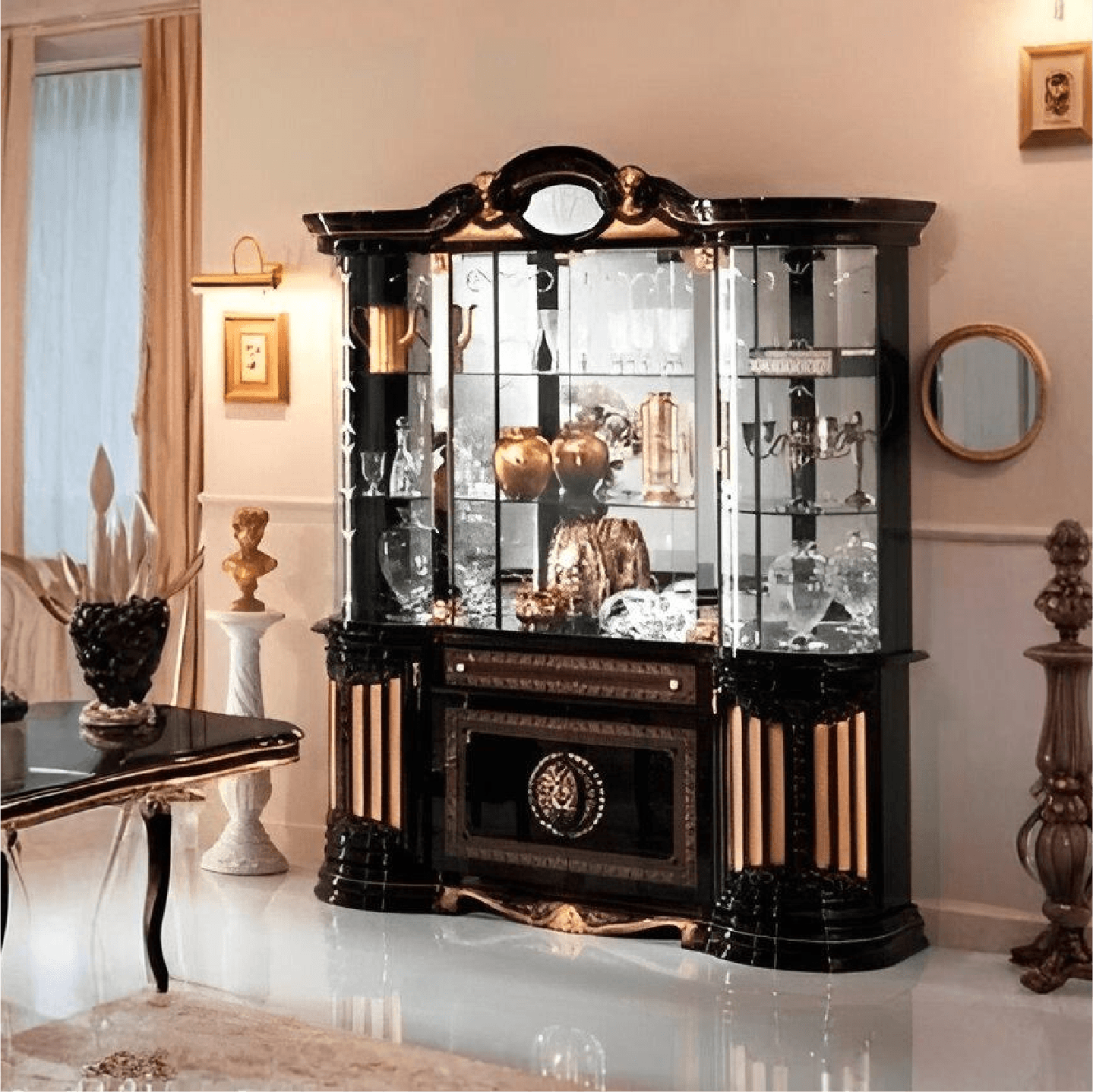 Betty 4 Door Display Unit in High Gloss Black & Gold Finish with Mirrored Detailing