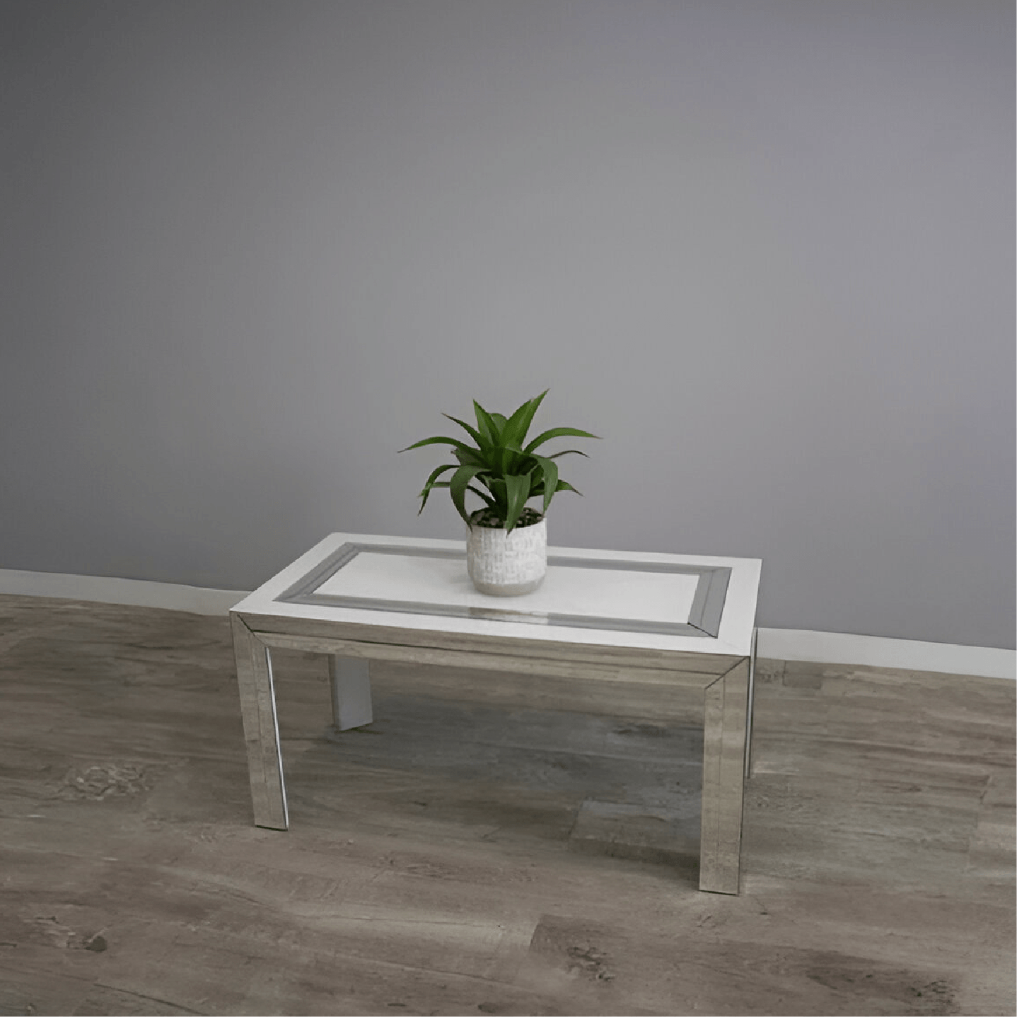 Stylish and sleek, this coffee table has a simple and clean design that makes it easy to match to your present and future decor! High polish silver legs, glossy white glass top that features silver mirror double strip. It’s minimal design will lift the room.