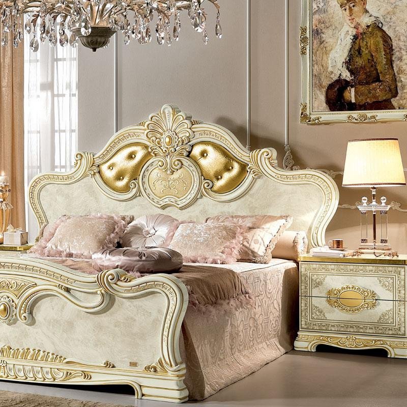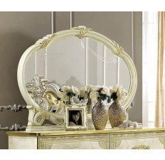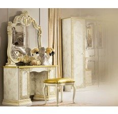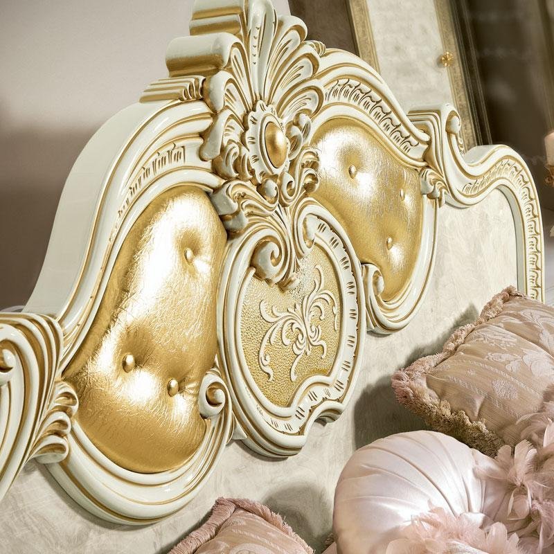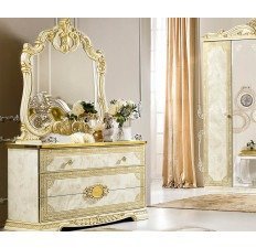 The Leonardo bedroom completes a collection in which The baroque style and classic lines combine to create An environment that evokes the splendor of 1600 places Gold details on ivory high gloss panels and arabesque Decorations with art Deco handles. Traditional and classic Italian designs in high gloss lacquered finish. The Leonardo baroque elements are embellished with gold antique Finishes performed by skilled craftsmen. Golden cornices highlight the beauty of the shell motif typical of this collection. Hand made with 18 carat gold leaf oval insert.