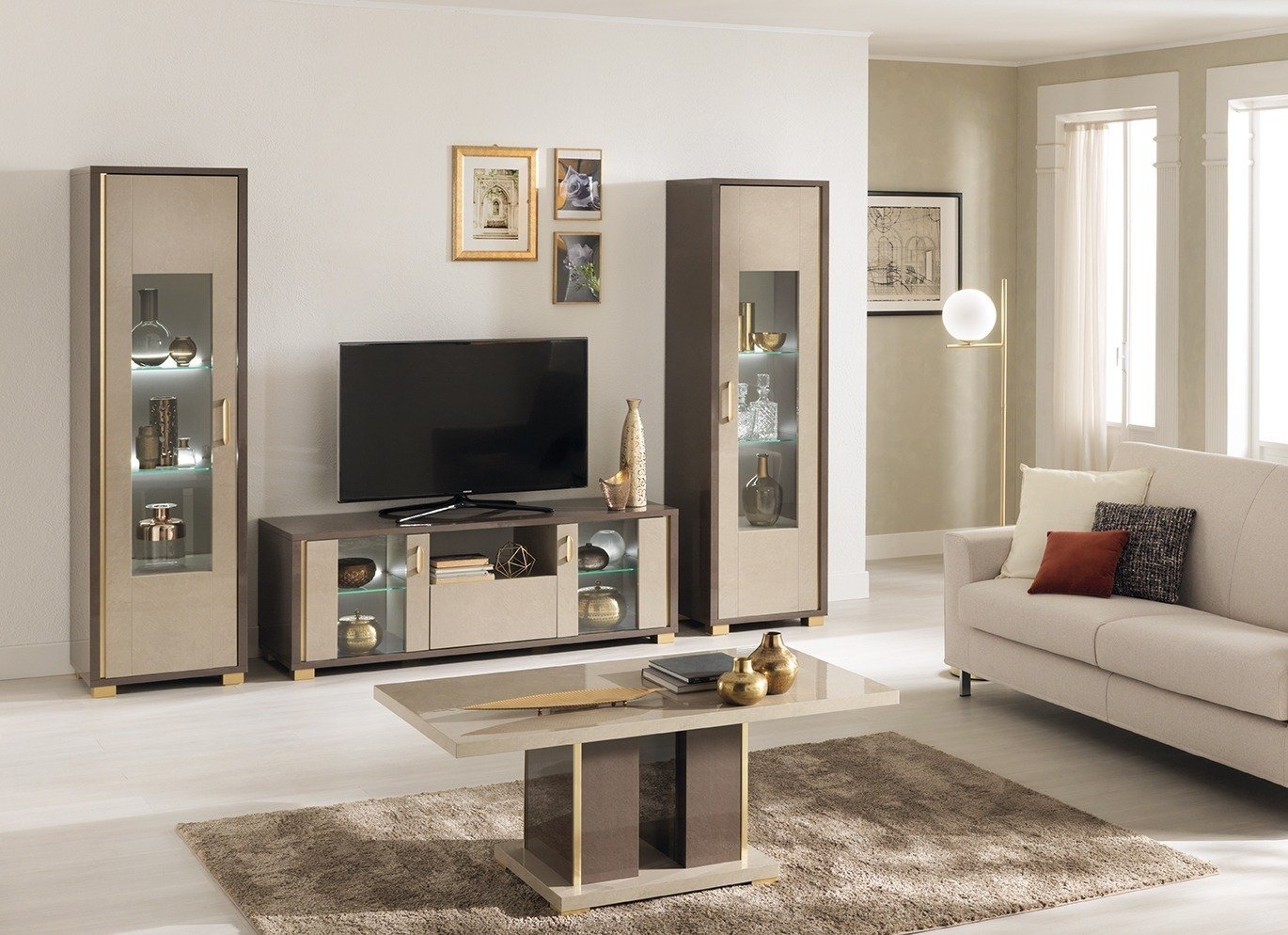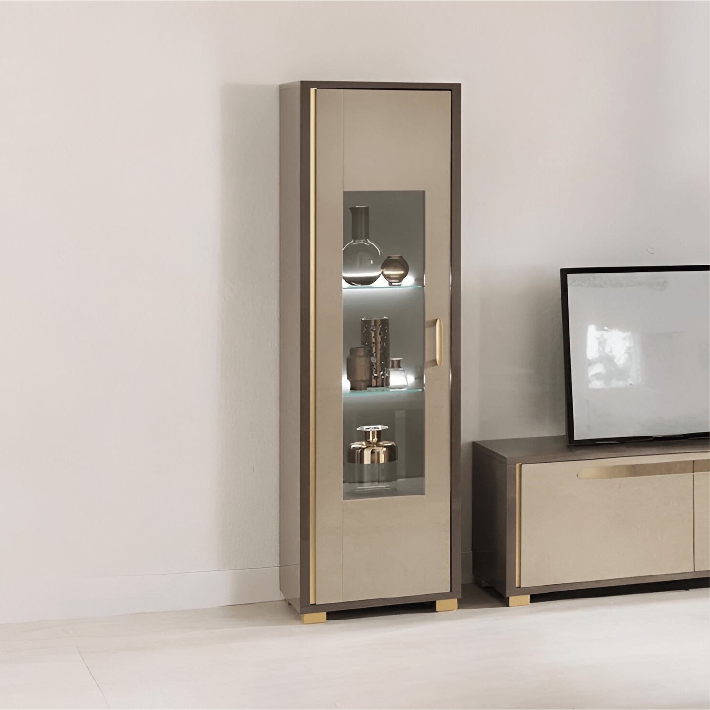 Cesar 1 Door Display Cabinet creates a sumptuous and appealing look which will brighten up your living room. Made from rich sand beige finish door fronts with contrasting brown effect top and side panels and golden frame and handle provides a commanding presence in any room. Its single glass door inside shelves and LED light gives it a warm tone whilst adding a relaxed feel to your dining room or anywhere about your home.