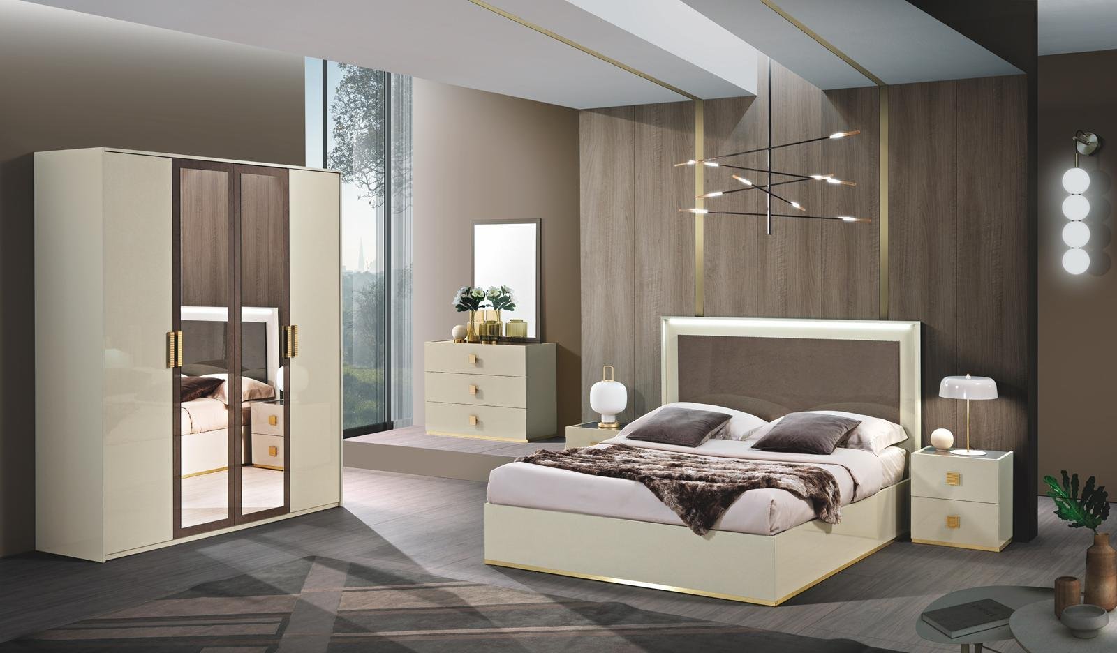 This range is premium built and crafted using pearl bronze shining finishing with chrome gold base details,handles, soft-closing system and LED mood lighting on the bed.