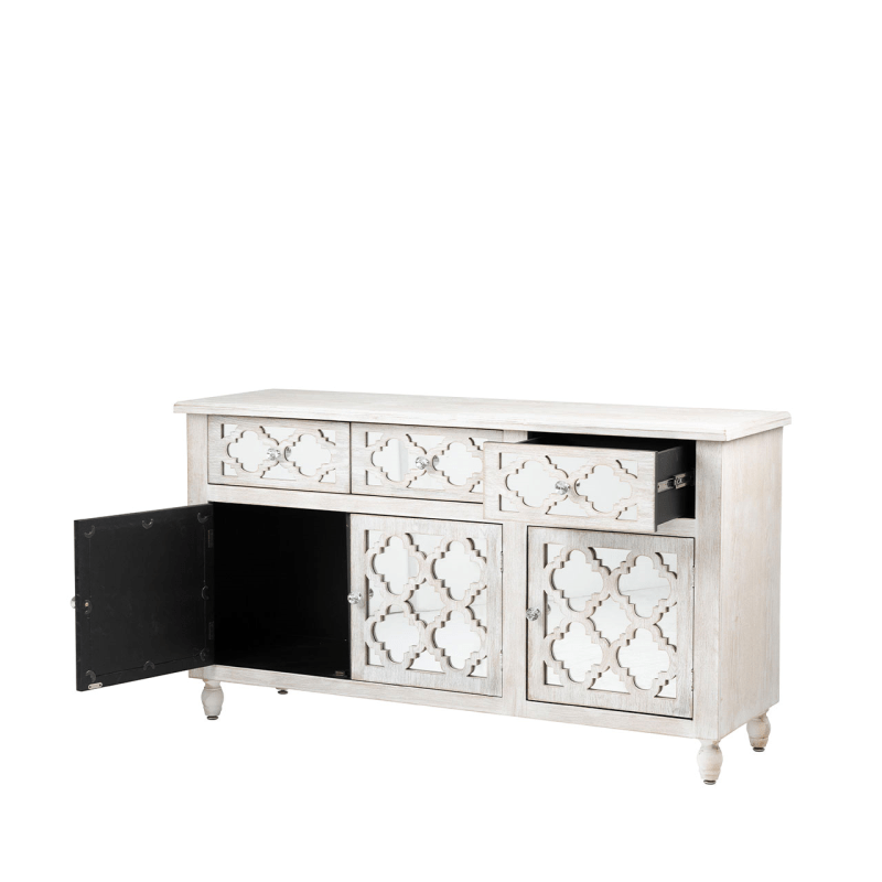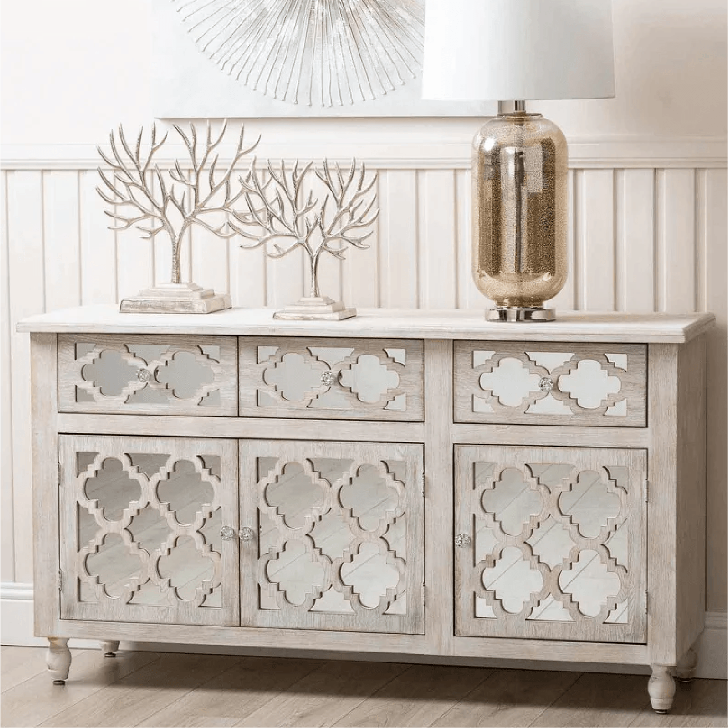 The Hampton Beach 3 door 3 drawer cabinet is inspired by the understated elegance of a New England beach home. Featuring a washed ash effect finish, the spacious doors and drawers are beautifully enhanced by mirror overlayed with intricate fretwork detailing and crystal handles.