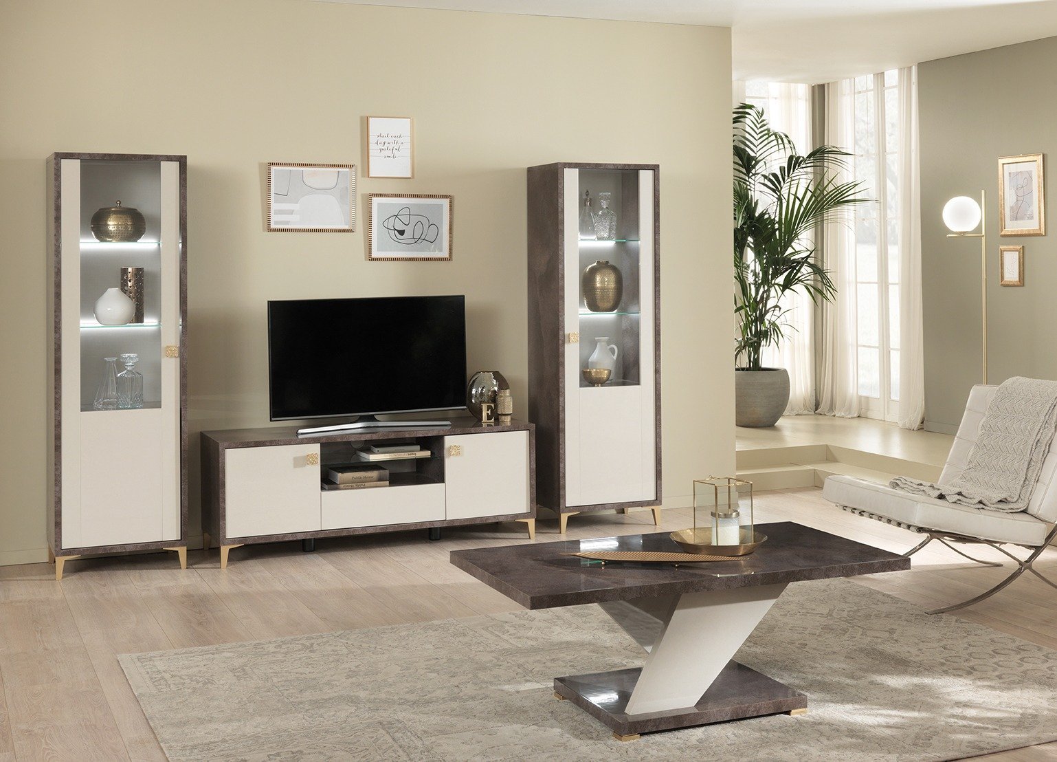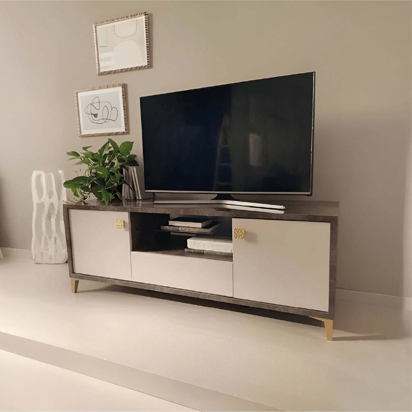 Ibiza TV Unit will give modern styled look and will bring a touch of charm to any interior. This gorgeous unit comes in a sand birch finish with contrasting brown effect and golden handle and leg will look fantastic in your living room. Featuring double glass fronted side doors with central drawer and open shelf design this TV Unit which are ideal for holding remotes, DVDs and other essentials.