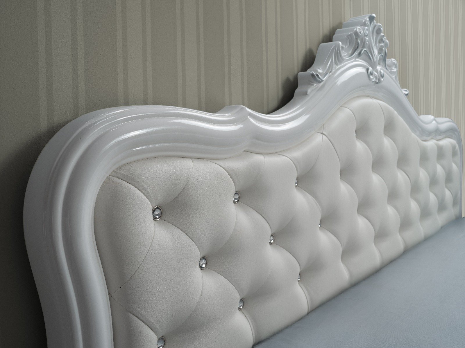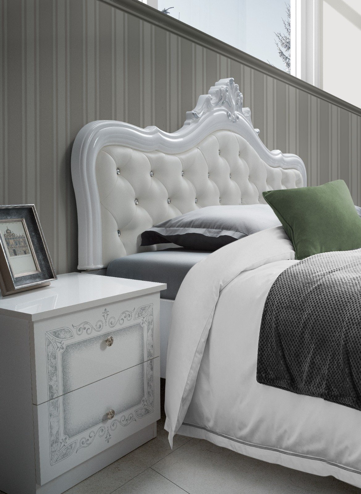 This is a stunning Italian bedroom suite beautifully finished in high gloss with detailed antique finish for a deeper richer look with a modern twist, Carefully hand crafted to high quality finish with raised capitation design on head & foot board. This is one of our best selling bedroom.