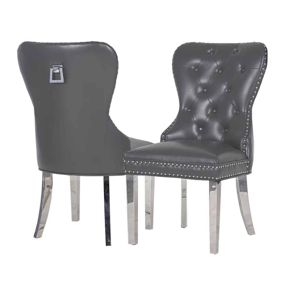 Mayfair Dining Chairs. Available in a Faux Leather finish and featuring a new style chrome square knocker. Double studding along the edge of the chair gives this piece a regal edge.