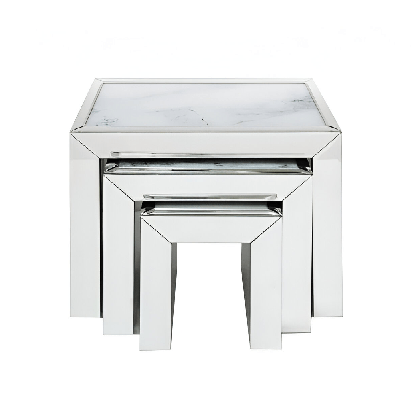 3 piece set. Simple, bold design. Each table features shiny mirror sides and legs, finished with a high gloss marble effect top.