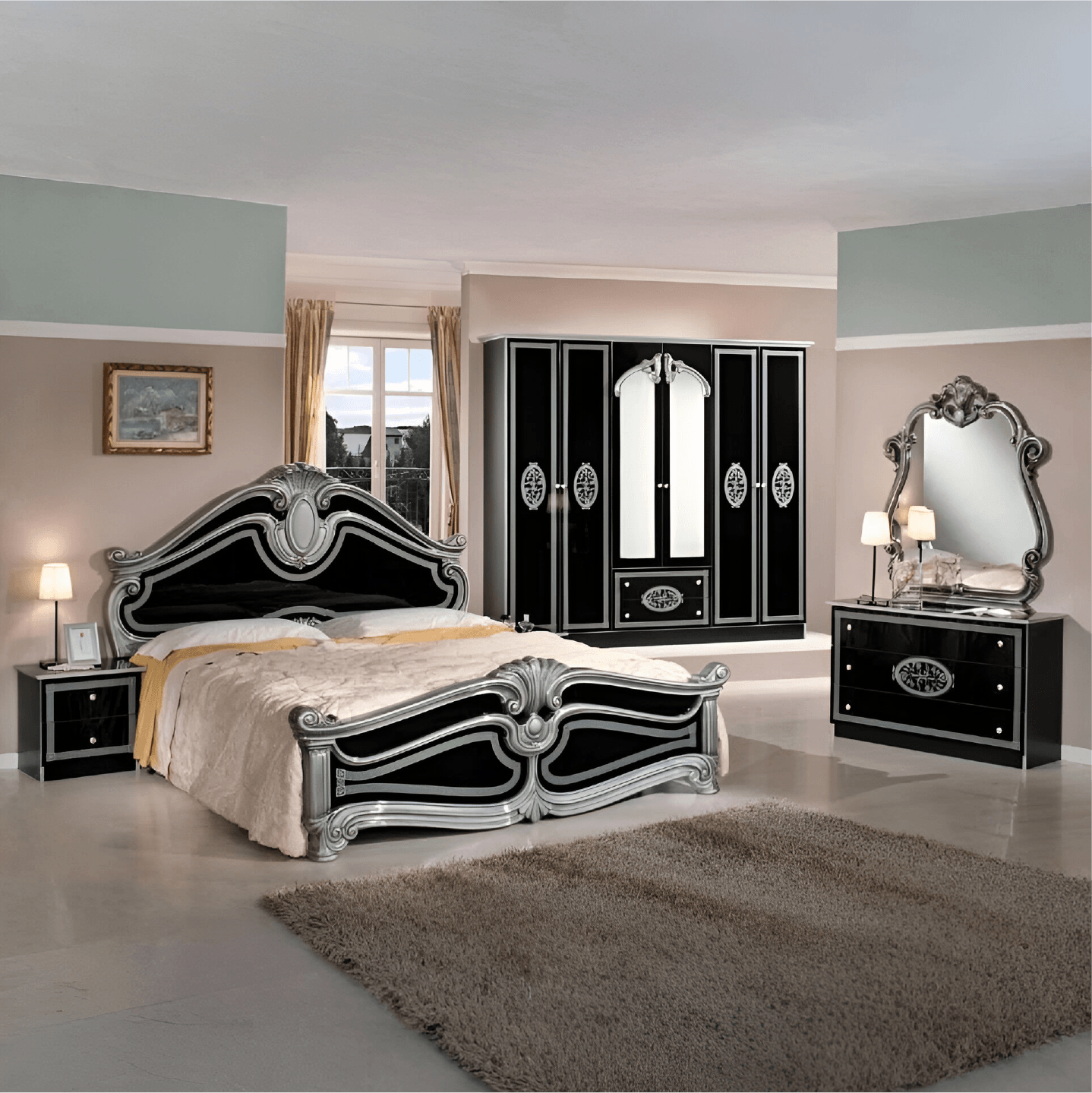 New Amalfi 6Doors Italian Bedroom Set Black-Silver by Topline Mobili