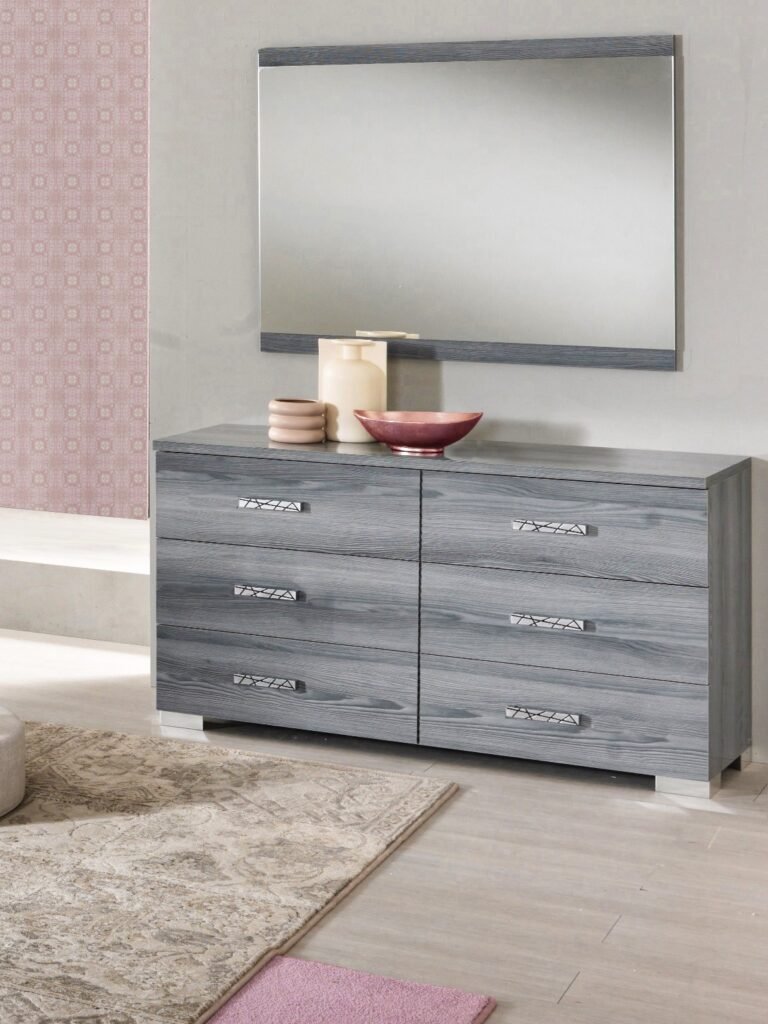 Nicole Bedroom Set has a contemporary design that will suit any modern bedroom setting. Included Bed Frame, 2 Night Table, 3 Drawer Dresser with Mirror all are made from high quality wood, ensuring an assuredly high level of resilience and robustness for a long lifespan within your home. With a modern twist and finished in grey and complemented with matching handle design and yet the beauty of all times and a wonderful statement to any bedroom.