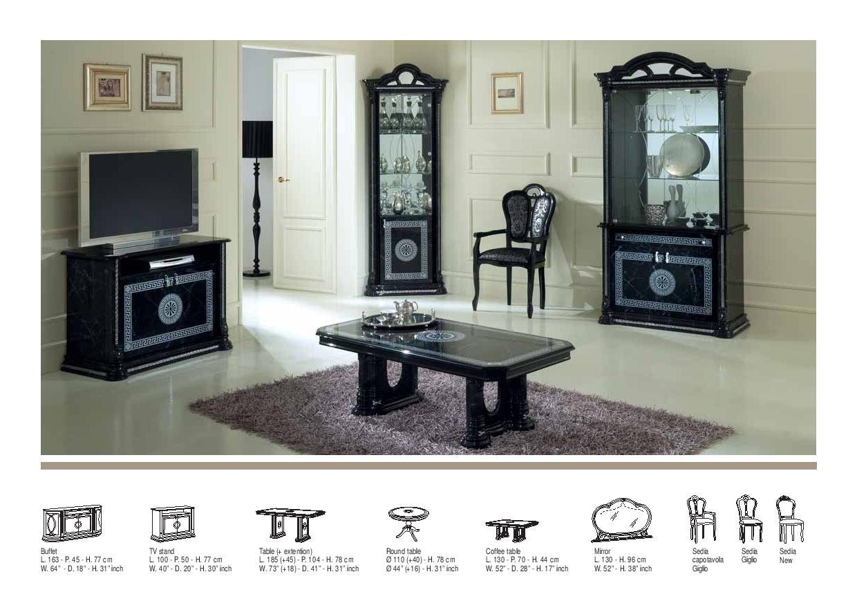 New Venus Black and Silver Italian 4 Door Vitrine structure made of ecological-melamine 18mm. thick and side and top lacquered with high gloss beige finish with serigraphy in Silver colour and handle in golden finish. The transparent crystal glass doors with engravings and small mirrors with “Greek” serigraphy on both sides of the display cabinets. The Spotlights on the internal upper part of each display cabinet. The cabinet backs made of fibre-board panels.