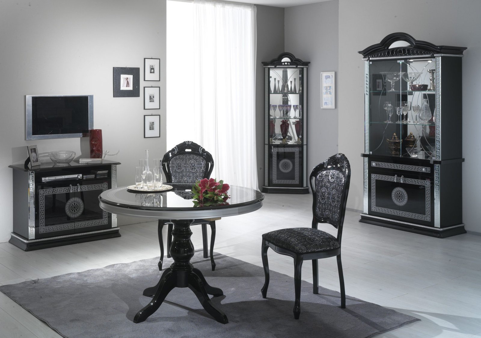 New Venus Black and Silver Italian 2 Door Vitrine structure made of ecological-melamine 18mm. thick and side and top lacquered with high gloss Black finish with serigraphy in silver colour and handle in silver finish. The transparent crystal glass doors with engravings and small mirrors with “Greek” serigraphy on both sides of the display cabinets. The Spotlights on the internal upper part of each display cabinet. The cabinet backs made of fibre-board panels.