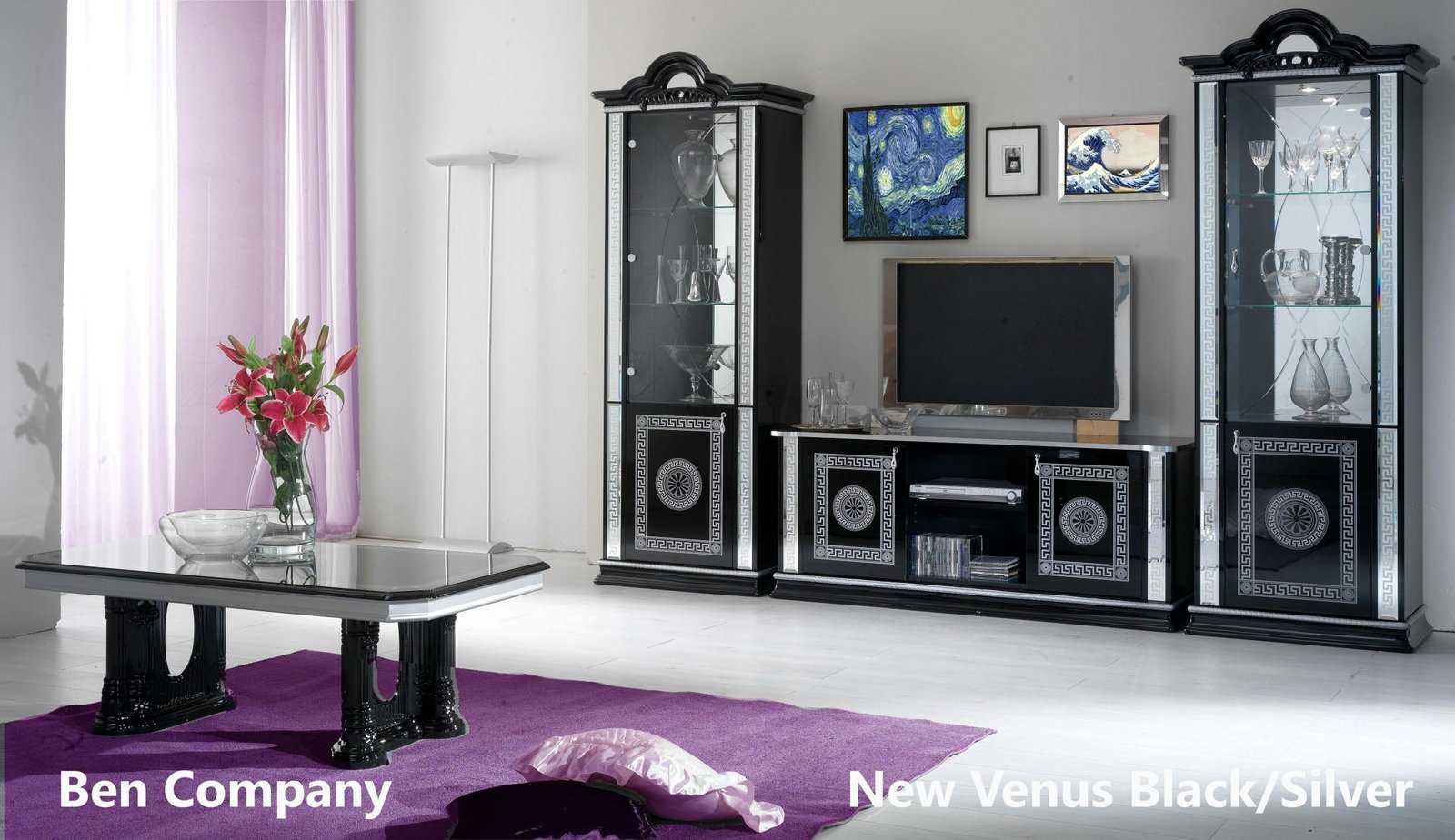 New Venus White and Silver Italian 1 Door Vitrine structure made of ecological-melamine 18mm. thick and side and top lacquered with high gloss White finish with serigraphy in Silver colour and handle in golden finish. The transparent crystal glass doors with engravings and small mirrors with “Greek” serigraphy on both sides of the display cabinets. The Spotlights on the internal upper part of each display cabinet. The cabinet backs made of fibber-board panels.