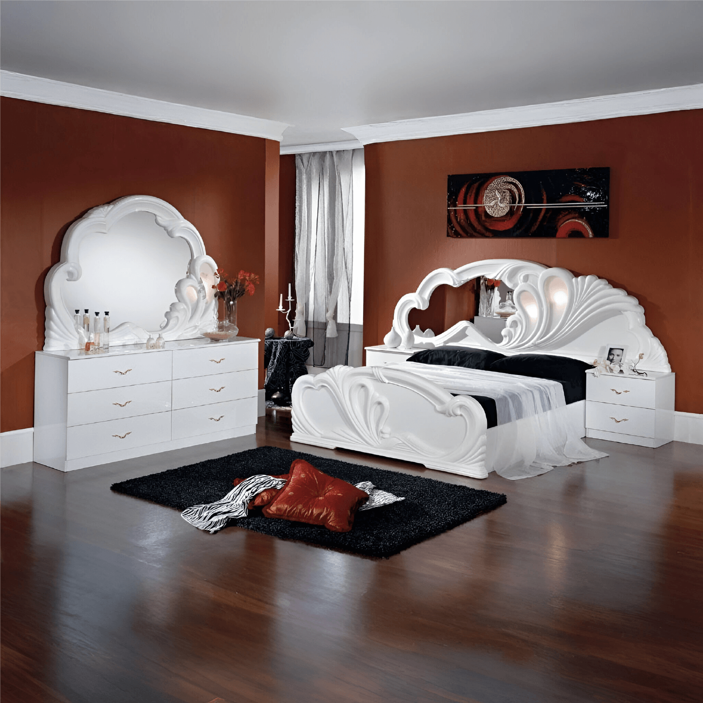 Paola White Bedroom Set is very attractive looking and that will be a perfect feature in any large bedroom. This Bedroom Set including 160cm Bed, 4 Door Wardrobe, 2 Night Table, Dresser, Mirror with light tasteful and attractive piece of décor. Made from high quality Italian material with rich white gloss finish with decorative frame and metal handle has a great look which will go well in a traditional setting.