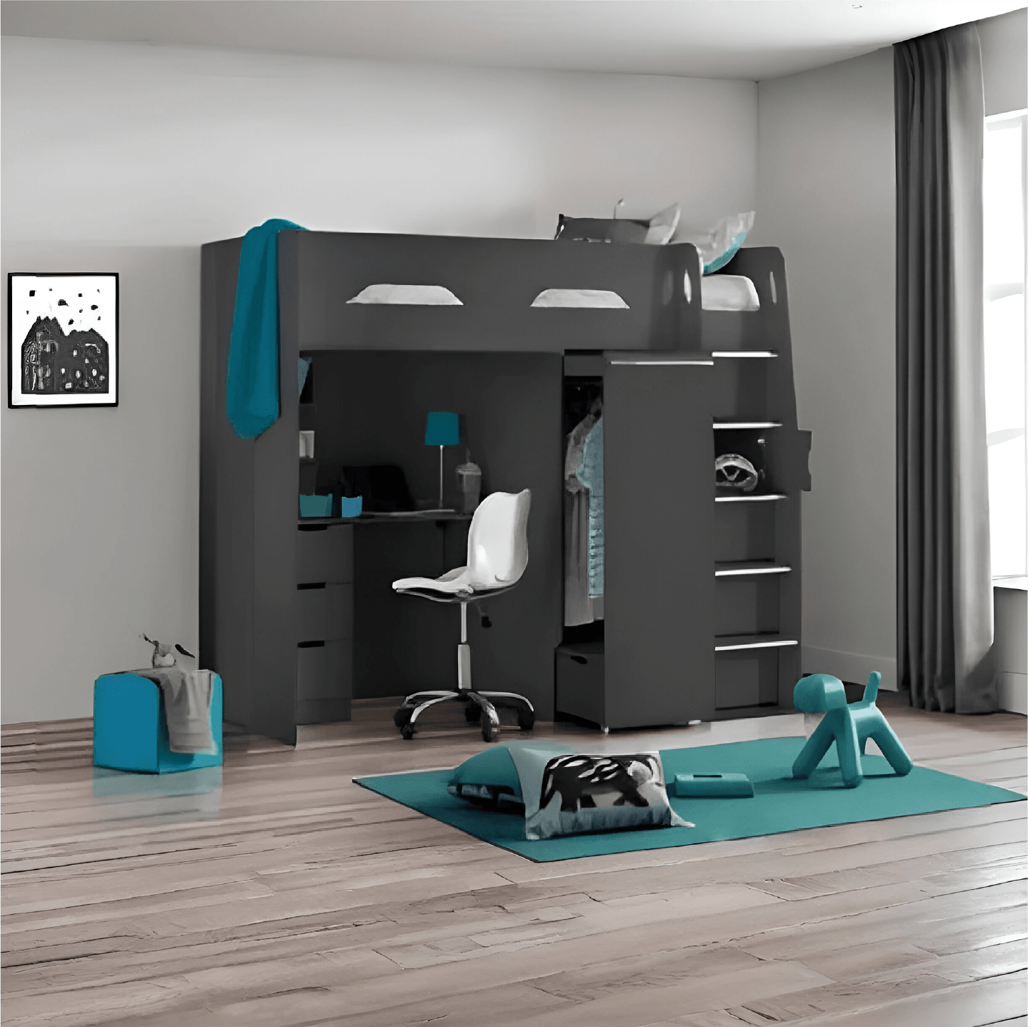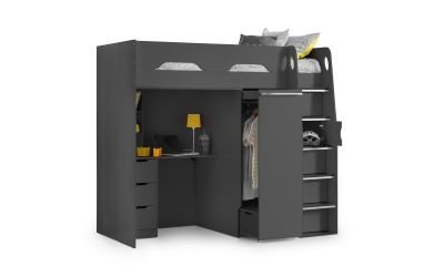 The Pegasus High Sleeper is the ultimate in functional bedroom furniture for kids and teenagers. Finished in anthracite with silver-grey accents, Pegasus features an incredibly practical pull-out wardrobe with integral storage drawer, which really maximises the space available within its compact footprint. The robust desk includes further storage drawers and cable holes and there is ample headroom for even the tallest kids to work in comfort. The robust ladder includes further hidden handy storage cupboards at every step.