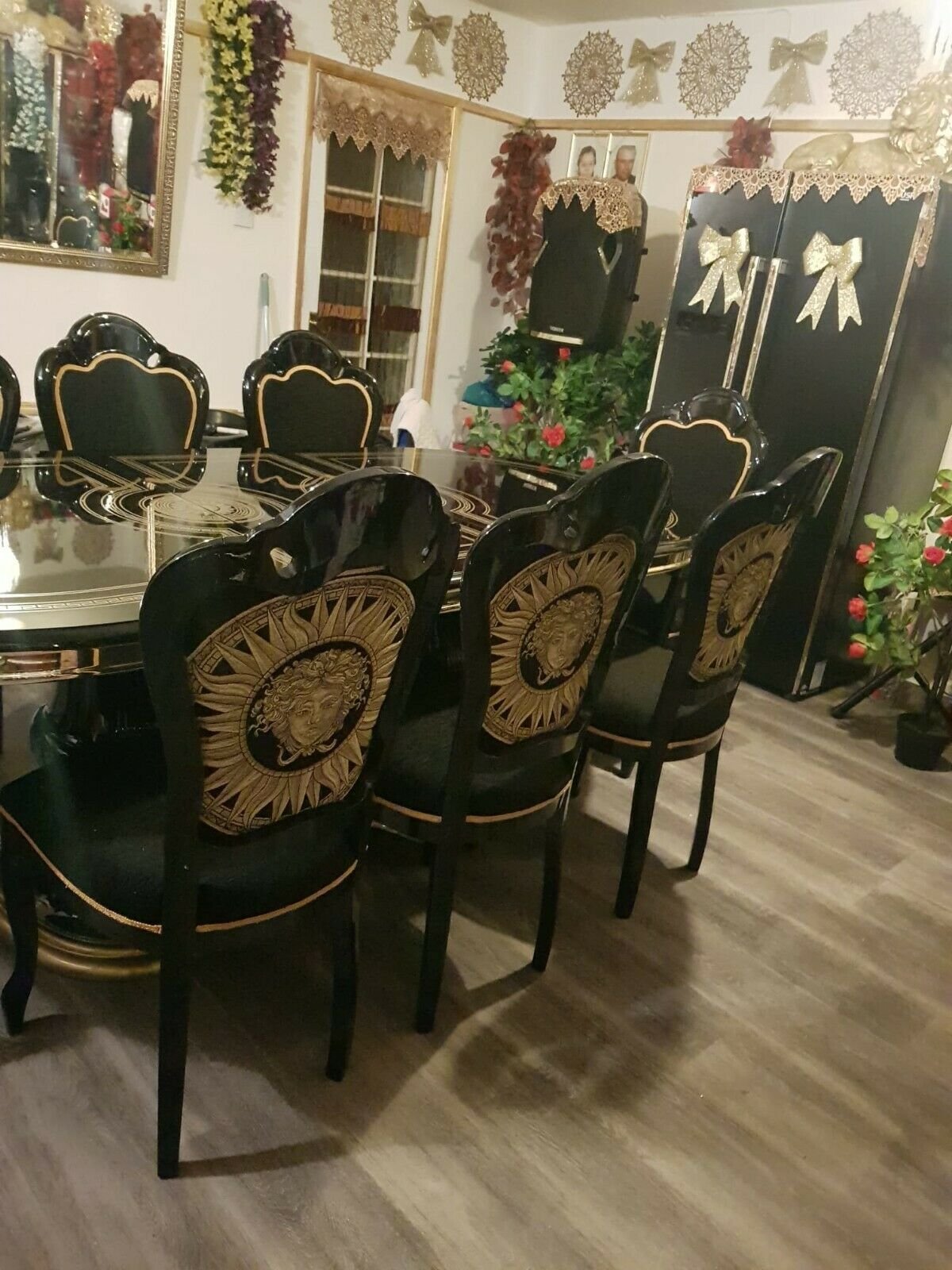 Italian Classic product of sheer luxury. Features a high gloss finish on all its furniture pieces, this set is adorned by golden Romanesque accents throughout its frame to give off a beautiful furniture contras features black or cream gloss with classic golden Roman accents. All pieces are made in Italy and materials are made of strict Italian origin Dining table with 6 chairs