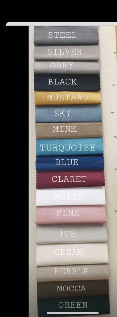 Aubergine Crushed velvet, Black Crushed velvet, Camel Crushed velvet, Cream Crushed velvet, Danim Crushed velvet, Gold Crushed velvet, Grey Crushed velvet, Ice Crushed velvet, Mink Crushed velvet, Red Crushed velvet, Teal Crushed velvet, White Crushed velvet