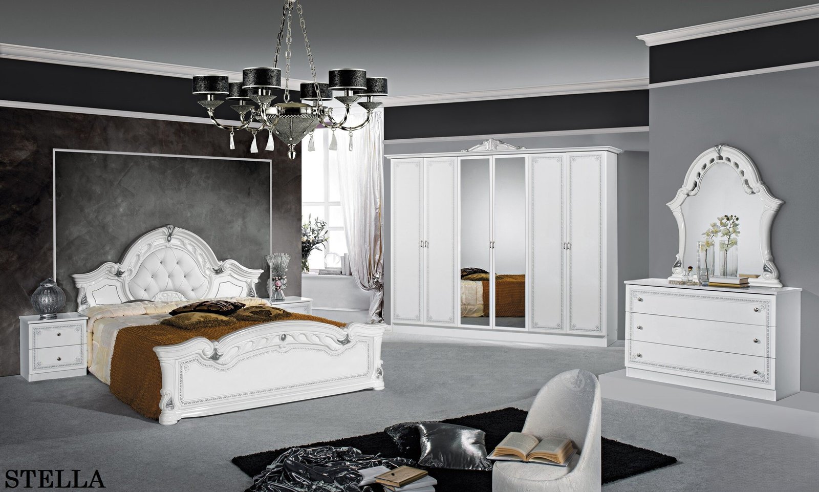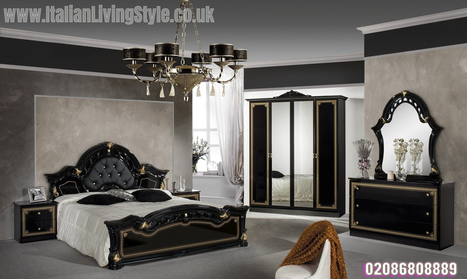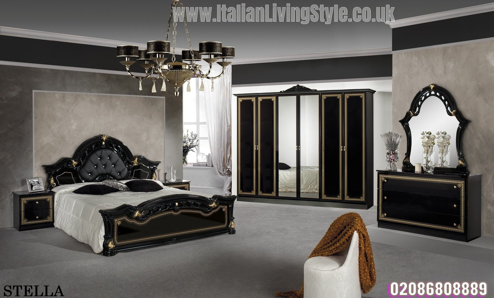 / Stella Italian High Glos 4 Doors Black-Gold Italian Bedroom Set